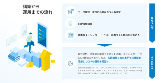 CDP(カスタマーデータプラットフォーム)を活用したデータ統合・分析・改善コンサルティングサービスを提供する株式会社UNCOVER TRUTH(本社:東京都新宿区、代表取締役CEO:石川敬三)は、これまでのCDP関連プロジェクトから得たノウハウを元に、導入後の企業がよく利用している連携データや機能に特化させることで、低コスト(従来型※のおよそ1/10)且つ短納期(従来型※のおよそ1/4)で、CDP環境を構築する「CDPクイックスタートパッケージ」の提供を2024年4月1日に開始したことをお知らせします。※当社のこれまでのCDP構築プロジェクト