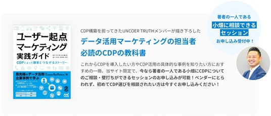 今回、サービスの販売開始を記念して、CDP専門書籍「ユーザー起点マーケティング実践ガイド」の著者の一人でもある当社COO小畑との無料相談セッションをご用意しております。CDPの選び方や自社のデータをもっとマーケティングに活用したい等のお悩みをお持ちの方はぜひお気軽にご利用ください。