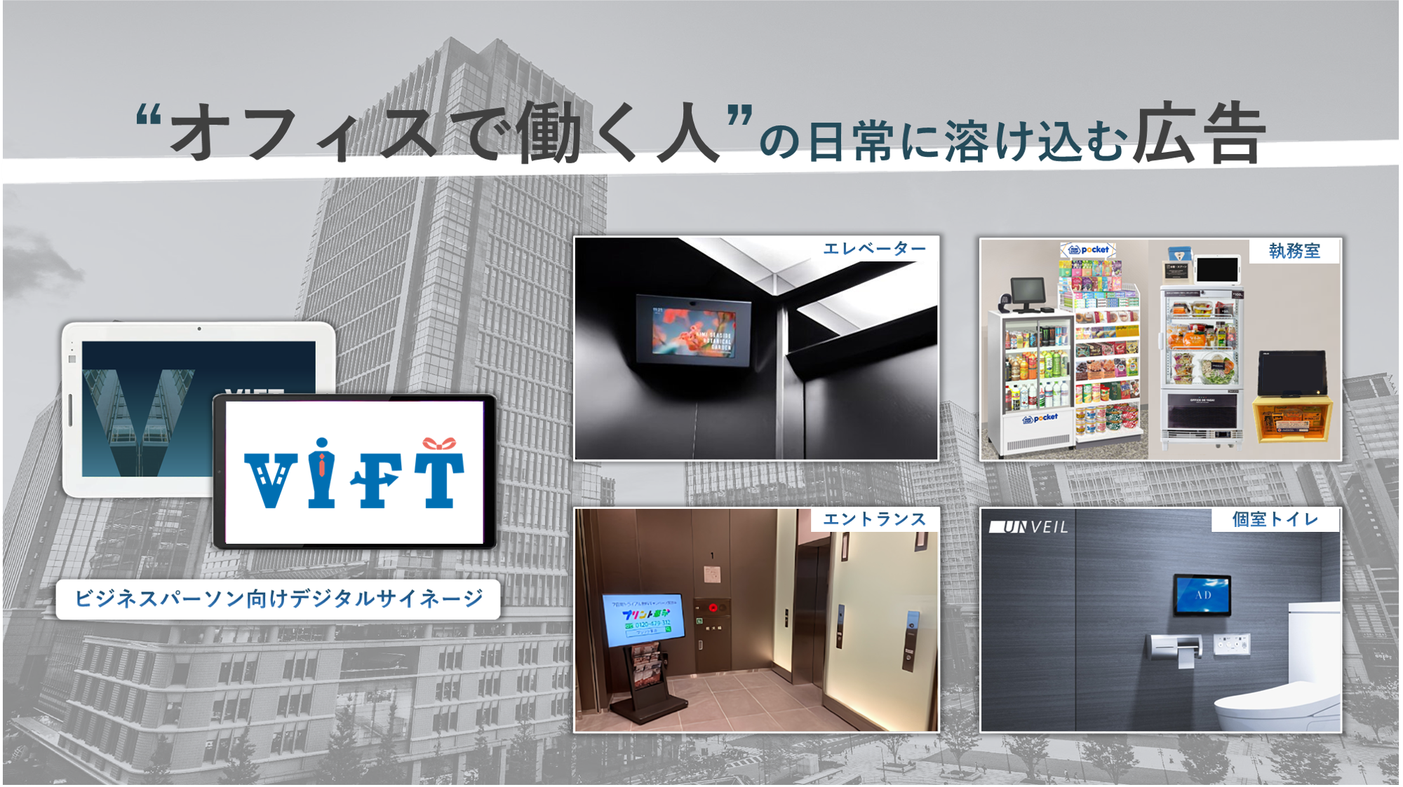これまで「VIFT」では、オフィスビル内のエレベーターや執務室、休憩室、個室トイレ、ビルエントランスのほか、オフィス街の喫煙所など、多くのビジネスパーソンの目に留まる場所にデジタルサイネージを設置してまいりました。