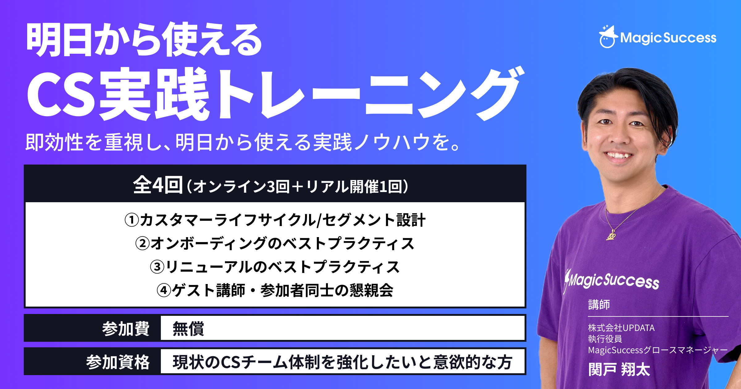 カスタマーサクセスに特化したAIワークスペース「MagicSuccess」を提供する株式会社UPDATA(東京都港区、代表取締役:岡村雅信)は、2026年3月より試験的に実施した「明日から使えるCS実践トレーニング(第1期)」が参加企業から高い評価を獲得したことを受け、本プログラムを正式サービスとしてリリースし、第2期(2026年5月14日~)および第3期(2026年5月27日~)の受講者募集を開始いたします。