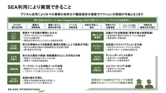 「AI技術の進化により、営業活動の価値とアプローチが根本的に変わろうとしています。この変革期において、インサイドセールスの第一人者であるブリッジインターナショナル様との協業は、大きな意義があります。当社のAI技術と、ブリッジインターナショナル様の実践的な営業ノウハウを組み合わせることで、日本企業の営業生産性を世界最高水準に引き上げることを目指してまいります。」