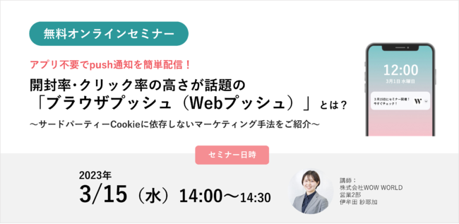 自社開発システム「WEBCAS(ウェブキャス)」と「WOW engage(ワオエンゲージ)」を通して、企業のマーケティングとカスタマーサクセスにおけるコミュニケーションの課題解決を支援する株式会社WOW WORLD(ワオワールド/本社:東京都品川区、代表取締役社長:美濃 和男、以下、当社)は、サードパーティーCookieに依存しない新しいチャネルとして注目される「ブラウザプッシュ(Webプッシュ)」をテーマにした無料オンラインセミナーを、2023年3月15日(水)に開催いたします。