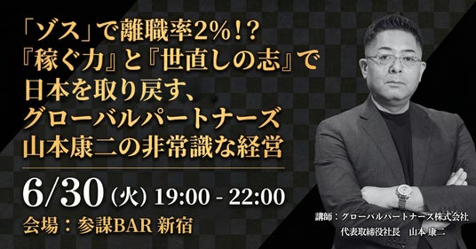 経営者コミュニティ「参謀」を運営する株式会社経営参謀(本社:東京都新宿区、代表取締役:新谷 健司)は、グローバルパートナーズ株式会社 代表取締役社長 山本康二氏を招き、離職率2%・採用コスト0円・社員平均年収約936万円を実現する「非常識な経営術」をテーマとした勉強会を2026年6月30日(火)に参謀BAR新宿にて開催します。「ホワイト化」によって力を失いつつある日本企業にカツを入れ、強い日本を取り戻すための考え方・取り組みを共有します。