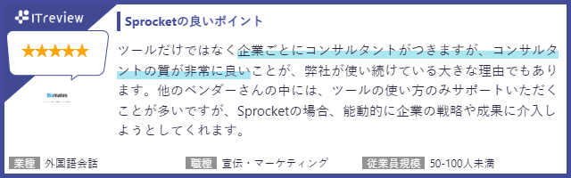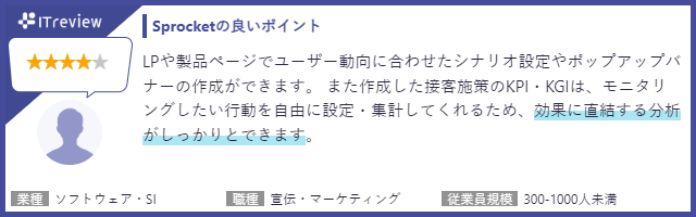 今回の受賞でSprocketは、評価対象となった4部門で特にユーザー満足度において高い評価を得ており、ABテスト、ヒートマップ部門では6期連続、Web接客においては5期連続のLeader受賞となりました。「機能面ではシナリオ分岐があるため、より丁寧なご案内ができる」「コンサルティングの方の企画提案から設計・公開・検証・再提案までお任せしているので、接客ツールを自社サイトに取り込むことができた」「ポップアップの効果を判定する上でABテストなどを実施し、検証することが大事だと思いますが、管理画面上でのABテスト結果もシンプルで分かりやすい」などの評価をいただいております。