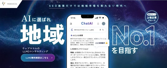 ウェブココル株式会社(本社:福岡県福岡市、代表取締役:杉岡玲生)は、Googleの「AI Overview」や「ChatGPT」や「Gemini」をはじめとする生成AI検索に対応し、地域ビジネスがAIからの引用・推奨を獲得するための新サービス「地域を制するLLMOコンサルティング」をリリースいたしました。 当社は東証グロース上場企業である株式会社デジタリフト(証券コード:9244)のグループ企業として、累計2,000万PV・記事制作8,500本以上の実績を持つSEOの知見をベースに、AI検索時代における企業の新たな集客チャネル構築を支援します。