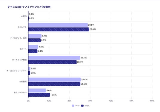 オーガニックのトラフィックは9%減少。AI経由のトラフィックは全体に占める割合は小さいが昨年比で632%増加