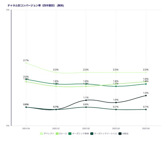 今年のユーザー行動として特徴的なこととして、AIが紹介するソースがトラフィックの構成に新たに加わった点が挙げられます。2025年の第4四半期において、こうしたAI経由のトラフィックが全体に占める割合は0.2%に過ぎなかったものの、632%増を記録し、急速に拡大しています。このように、AIの直接的なシェアは依然として少ないとはいえ、その影響はすでに従来の主なチャネルに及んでいます。「AIによる概要(AI Overview)」によって、クリックなしで答えが得られるようになったため、オーガニック検索経由のトラフィックは9%減少。消費者がブランドにたどり着く方法に構造的な変化が生じていることを物語っています。