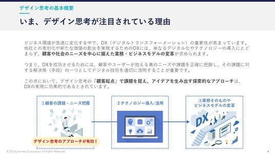 この点において、デザイン思考の「顧客起点」で課題を捉え、アイデアを生み出す探索的なアプローチは、DXの実現に効果的であるとされています。