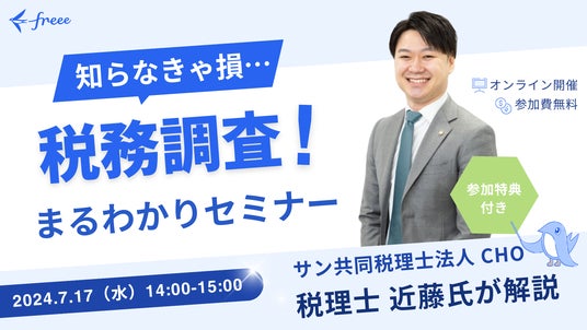 サン共同税理士法人(本社:東京都港区、代表社員: 朝倉 歩)にて役員を務める税理士・近藤昴は、2024年7月17日(水)14時00分よりフリー株式会社(本社:東京都品川区、代表者: 佐々木大輔)主催のセミナーに登壇いたします。