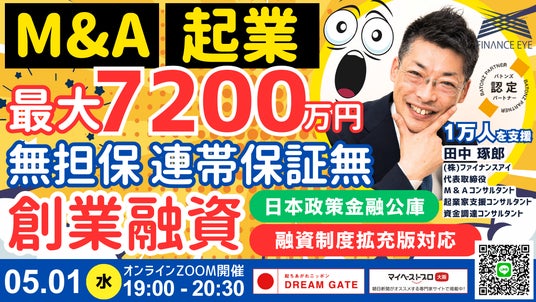 「M&A起業やM&A買収にも使える。社長の個人連帯保証無し!無担保で最大7200万円!日本政策金融公庫の新規開業資金(創業融資)はコレで解決!落とし穴にハマらないための融資審査の本音と建前~1万件以上を支援したファイナンスアイ田中琢郎社長だから分かるリアルを伝える」(※参加者の顔出しナシ)と題したこのセミナーでは、田中社長自らが、1万人以上の起業家や経営者の融資を支援した実体験をもとに、M&A起業やM&A買収資金にも使えて、創業期の有力な資金調達手段である創業融資を成功させるポイントを分かりやすくお伝えします。本セミナーは、平日夜の2024年5月1日(水)19:00より、オンラインでZOOMを使用して実施されます。コロナ禍を乗り越え、億超えの起業家を生み出し続けたファイナンスアイが、良い案件も悪い案件も1万人以上をリアルに支援したから分かる融資審査の本音と建前、M&Aのオカネとリスクの解決策を分かりやすく伝えます。セミナーでは田中社長とライブで質疑応答ができるので厳格化する融資審査を乗り越えるために具体的なアドバイスが欲しい人はチャンスです。このセミナーを受講すれば、あなたのビジネスもファイナンスの力を活用して成功の軌道に乗ることができるでしょう。