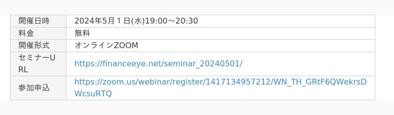 株式会社ファイナンスアイ(所在地:大阪市、代表:田中琢郎)は、日本政策金融公庫が2024年4月1日に発表した、社長の個人連帯保証無しの無担保無保証で最大7200万円のスタートアップ・起業家向けの融資支援制度の拡充に対応した、M&A起業を考える起業家・M&A買収・中小企業の経営者に向けて特別なセミナーを開催いたします。「M&A起業やM&A買収にも使える。社長の個人連帯保証無し!無担保で最大7200万円!日本政策金融公庫の新規開業資金(創業融資)はコレで解決!落とし穴にハマらないための融資審査の本音と建前~1万件以上を支援したファイナンスアイ田中琢郎社長だから分かるリアルを伝える」(※参加者の顔出しナシ)と題したこのセミナーでは、田中社長自らが、1万人以上の起業家や経営者の融資を支援した実体験をもとに、M&A起業やM&A買収資金にも使えて、創業期の有力な資金調達手段である創業融資を成功させるポイントを分かりやすくお伝えします。本セミナーは、平日夜の2024年5月1日(水)19:00より、オンラインでZOOMを使用して実施されます。コロナ禍を乗り越え、億超えの起業家を生み出し続けたファイナンスアイが、良い案件も悪い案件も1万人以上をリアルに支援したから分かる融資審査の本音と建前、M&Aのオカネとリスクの解決策を分かりやすく伝えます。セミナーでは田中社長とライブで質疑応答ができるので厳格化する融資審査を乗り越えるために具体的なアドバイスが欲しい人はチャンスです。このセミナーを受講すれば、あなたのビジネスもファイナンスの力を活用して成功の軌道に乗ることができるでしょう。会社の未来のオカネをクリエイティブする事がファイナンスです。