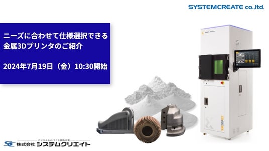 株式会社システムクリエイト(本社:大阪府東大阪市荒本新町、代表:川上正義)は、Xact Metal, Inc.社(アメリカ)製金属3Dプリンタ「XM200G」の国内販売に伴い、2024年7月19日(金)10:30に、無料オンラインウェビナー「ニーズに合わせて仕様選択できる金属3Dプリンタのご紹介」を開催いたします。
