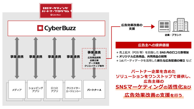 「サイバー・バズSNSマーケティングパートナープログラム」とは、メディアやショッピングアプリ、口コミアプリ、クリエイターエージェンシー等と連携し、オリジナル広告商品や共同商品などの開発やデータ連携等を通し、広告主様のSNSマーケティングの活性化及び広告効果改善の支援を行うプログラムです。パートナーとデータを連携させることで、サードパーティーCookieへの規制の中で、ファーストパーティーデータを活用した新たな広告配信手法の精度を高めたり、パートナー企業を含めたソリューションをワンストップで提供することで、マーケティング効果の最大化を図ります。