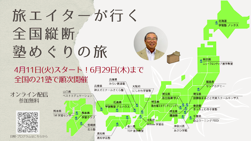 「自立学習」「生涯学習」を事業の軸とし、学習塾・学校・生涯学習教室向けICT教材システムの企画・制作・販売を手がける株式会社日本コスモトピア(本社:大阪府大阪市、代表取締役社長:下向 峰子、以下:日本コスモトピア)は、全国の学習塾と学習塾に通うユーザーを対象とした学習塾向けオンラインセミナー「創立40周年特別企画~旅エイターが行く全国縦断塾めぐりの旅」を、本日2023年4月11日(火)から6月29日(木)まで全国の21塾にて開催します。