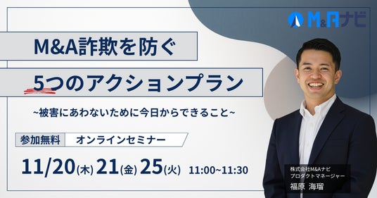 M&Aテクノロジーを展開する株式会社M&Aナビ(本社:東京都品川区、代表取締役:瀧田 雄介、以下「当社」)は、中小企業の経営者向けにM&A詐欺被害にあわないために取るべきアクションプランについて解説するセミナーを2025年11月20日(木)、21日(金)、25日(火)の11時00分から開催いたします。