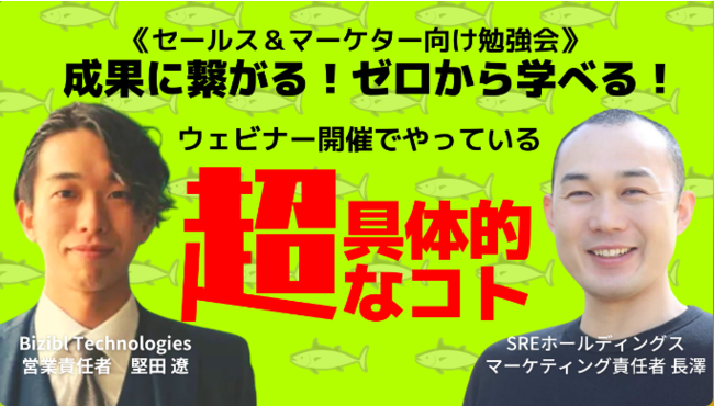 株式会社Bizibl Technologies(本社:大阪市北区、代表取締役:花谷燿平、以下Bizibl)とSREホールディングス株式会社(本社:東京都港区、代表取締役CEO:西山和良、以下SREホールディングス)が 「《セールス&マーケター向け勉強会》成果に繋がる!ゼロから学べる!ウェビナー開催でやっている超具体的なコト」 と題したウェビナーを9月27,28,29日に連日開催いたします。