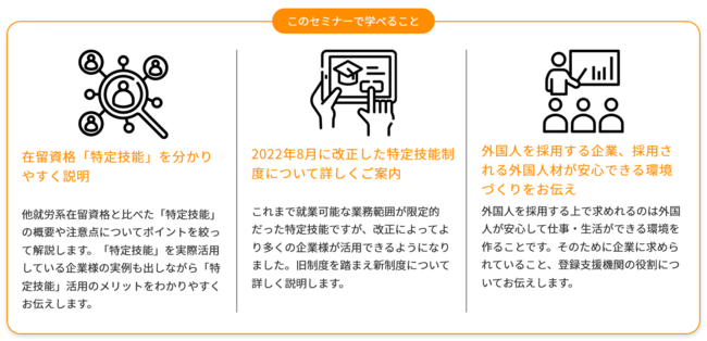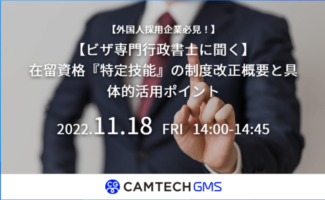 人材コンサルティング、海外人材マネジメントサービス、各種研修サービスを提供する株式会社キャムテック(代表:西野弘一 本社:東京都港区浜松町2-4-1 世界貿易センタービルディング南館)は、2022年11月18日(金)に、外国人採用を検討する企業向けの無料オンラインセミナー「【ビザ専門行政書士に聞く】在留資格『特定技能』の制度改正概要と具体的活用ポイント」を開催します。