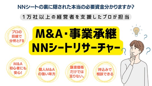 NNシートリサーチャー|個人M&A・スモールM&A・起業M&Aの味方NNシートリサーチャー|個人M&A・スモールM&A・起業M&Aの味方個人M&AやスモールM&Aの強い味方!NNシートの裏に隠された本当に必要な投資金額も分かる~DD調査人がレポーティング