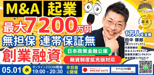 M&A起業も買収資金も社長の連帯保証ナシ!無担保で最大7200万円!日本政策金融公庫の新規開業資金の創業融資はコレで解決!融資審査の本音と建前が分かる。1万人と伴走したファイナンスアイ田中琢郎が直伝。