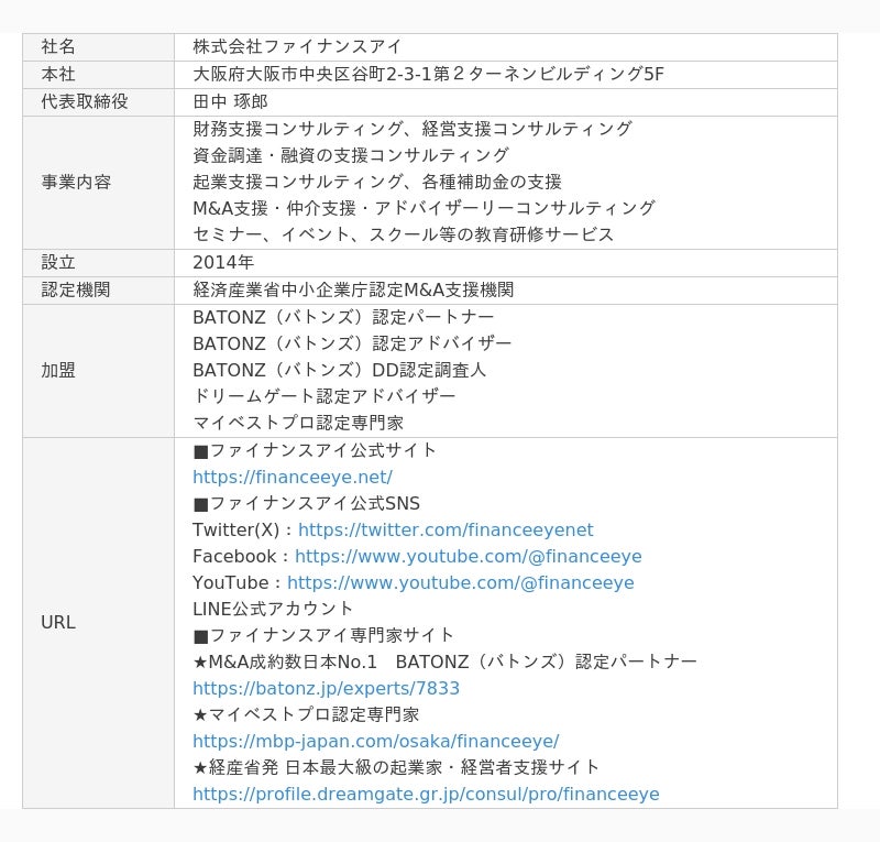 株式会社ファイナンスアイ(本店:大阪府大阪市、代表取締役:田中 琢郎。以下、ファイナンスアイ)は、国内最大級の事業承継・M&Aプラットフォーム『TRANBI(トランビ)』のM&A支援の認定専門家として活動を開始しました。ファイナンスアイは、経済産業省中小企業庁のM&A支援機関登録制度に登録済で、2014年の創業時から大阪を中心に全国10,000件以上の起業家や経営者の資金調達やM&Aの相談に対応し、現在も毎月150件以上の新規相談に対応しています。M&A支援の分野においてはM&A仲介・案件分析・DDだけではなく、特にM&A起業や買収資金の資金調達や金融機関対応の支援に強みを持っています。これまでM&A起業や買収の資金調達・金融機関対応に悩んでおられた方々に解決策を伝えていくために、毎週セミナーも開催しています。今後もより一層、多くのM&A・事業承継の成立に向けて皆さまを支援していきます。