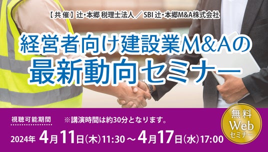 辻・本郷 税理士法人(本社:東京都新宿区、理事長:徳田孝司)は、SBI 辻・本郷M&A株式会社(本社:東京都千代田区、代表取締役:小林堅悟)と共催で「経営者向け建設業M&Aの最新動向セミナー」を開催します。本セミナーでは建設業を取り巻く環境から、なぜM&Aが増えているのか、わかりやすく解説します。 また、建設業でよくみられる事例や、M&Aをする上での注意点なども説明します。