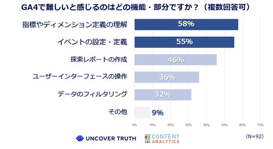 具体的にどのような点に難しさを感じているかについては(複数回答可)、「指標やディメンション定義の理解」(58%)、「イベントの設定・定義」(55%)が特に多く、Webサイトに訪問したユーザーの深堀分析や行動トラッキングする際の設定に難しさを感じていることが分かりました。