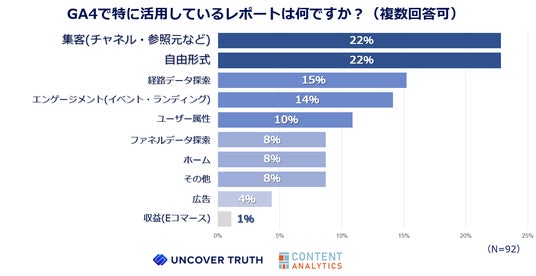 GA4で特に利用しているレポート機能については(複数回答可)、「集客(チャネル・参照元など)」(22%)、「自由形式」(22%)、次いで、「経路データ探索」(15%)、「エンゲージメント(イベント・ランディング)」(14%)が上位となりました。