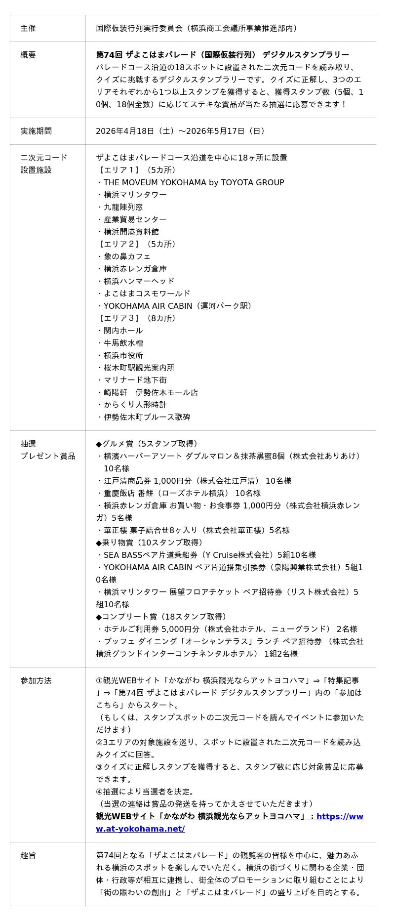 株式会社アットヨコハマ(本社:横浜市神奈川区栄町7-1/代表取締役:上野健彦・宮原漢二)※は、国際仮装行列実行委員会(横浜商工会議所事業推進部内)と連携し、ザよこはまパレードのコース沿道を中心に、デジタルスタンプラリーを4月18日(土)から5月17日(日)まで実施いたします。
