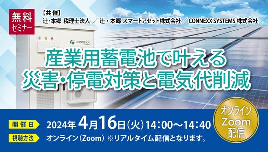辻・本郷 税理士法人(本社:東京都新宿区、理事長:徳田孝司)は、辻・本郷 スマートアセット株式会社(本社:東京都新宿区、代表取締役社長:吉川僚)とCONNEXX SYSTEMS株式会社(本社:京都府相楽郡、代表取締役:塚本壽)の3社共催で「産業用蓄電池で叶える災害・停電対策と電気代削減」セミナーをオンライン(Zoom)にて配信いたします。本セミナーでは、自家消費型太陽光発電・蓄電池を取り巻く市場の最新情報と導入事例をご紹介しながら、運用イメージをわかりやすくお伝えします。最後には、産業用蓄電池の課題と、そのソリューションとして産業用蓄電池LUVISをご紹介します。