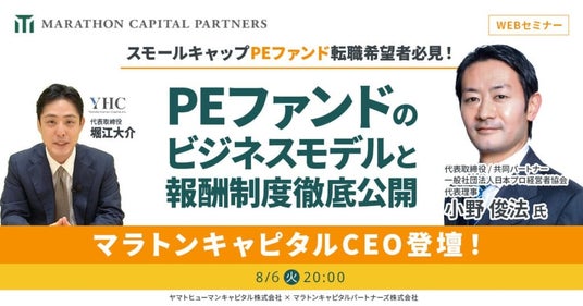 ヤマトヒューマンキャピタル株式会社(本社:東京都千代田区、代表取締役:堀江 大介)は、2024年8月6日(火) 20:00よりオンラインにて、マラトンキャピタルパートナーズ株式会社の代表取締役/共同パートナー/一般社団法人日本プロ経営者協会代表理事の小野 俊法氏にご登壇いただくウェビナー『 PEファンドのビジネスモデルと報酬制度徹底公開』を開催いたします。