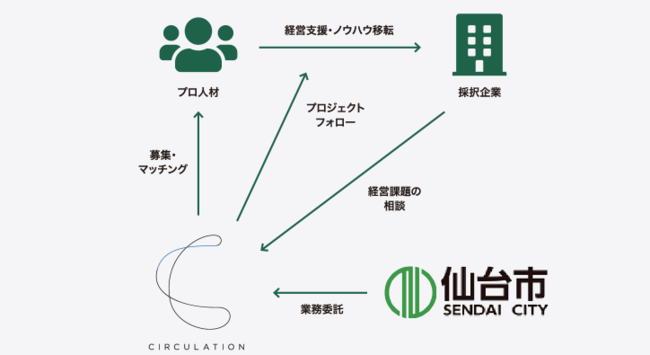 仙台市とサーキュレーションは2018年より中小企業の収益力向上を目的とした「外部人材による新規事業創出プログラム」や2019年の「外部のプロ人材を活用した経営支援事業」、2020年「外部人材による中小企業の経営革新支援事業」など継続的に中小企業におけるプロ人材活用の取り組みを行ってきました。昨年新たに始まった本事業においても2年連続の受託となります。