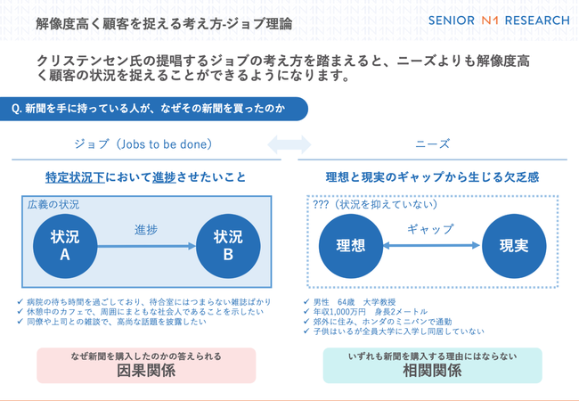 シニアN1リサーチとは、マスを定量だけで見るのではなく定性インタビューを通して具体的な1人を分析するリサーチメニューです。クリステンセン氏の提唱する※ジョブ理論を活用することで、ニーズよりも解像度高く顧客の状況を捉えることができるようになります。