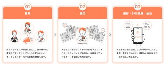 アンバサダープランとは、商品やサービスの撮影・発信を行うアンバサダーを募集し、企業独自のUGCを大量に作成出来るプランです。熱量が高く、リアルな視点でのUGCは、SNS上でユーザーの共感を呼ぶことに繋がりファン層の拡大と育成に貢献します。集まった素材や投稿は無期限多用途に二次利用可能です。※アンバサダープラン詳細につきましては、以下弊社サイトをご覧ください。