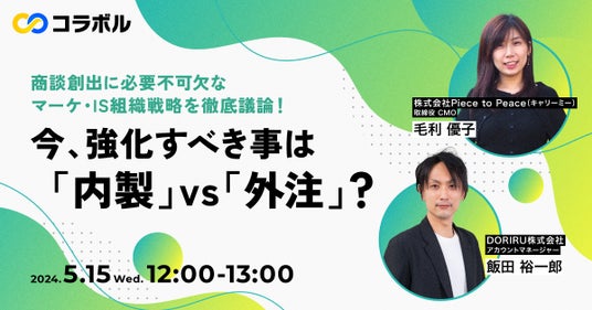 マーケティング領域を中心に活躍する業務委託の「プロ人材」と企業とのマッチングサービスを行うキャリーミー(https://carryme.jp/agent/)を運営する株式会社Piece to Peace(本社:東京都千代田区、代表取締役:大澤亮)は、DORIRU株式会社との共催で2024年5月15日12時よりウェビナー「商談創出に必要不可欠なマーケ・IS組織戦略を徹底議論! 今、強化すべき事は「内製」vs 「外注」?」を開催いたします。