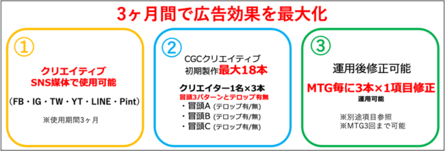 また、従来では現実的でなかったクリエイター動画の納品後の修正を可能とし、最適なPDCAのために、3ヶ月間クリエイティブを微調整することができるプランとなっております。