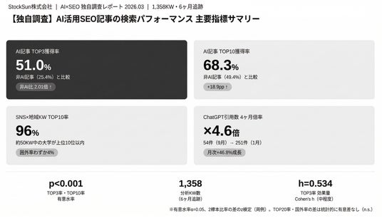 StockSun株式会社(本社:東京都新宿区、代表取締役:岩野 圭佑)は、自社オウンドメディア(マーケティング支援領域)のAI活用記事104KW・非AI記事1,254KW、計1,358キーワードのGoogle検索順位を6ヶ月間追跡した結果を公開します。