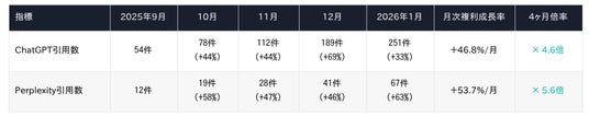 【調査結果4.】生成AI検索(AEO)への波及:月次引用数推移Google検索順位と並行して、ChatGPT・Perplexityなど生成AI検索への引用数も追跡しました。