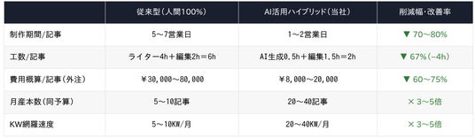 ※費用は社内工数の時給換算参考値。AI活用でも編集工数(E-E-A-T担保)の省略は不可。