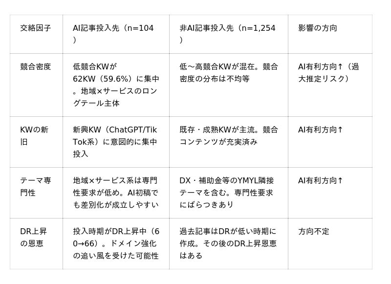 【調査結果3.】交絡因子の定量的開示AI記事と非AI記事は投入先KWの属性が異なります。この差を考慮せずに比較すると、AI記事の効果を過大推定するリスクがあります。