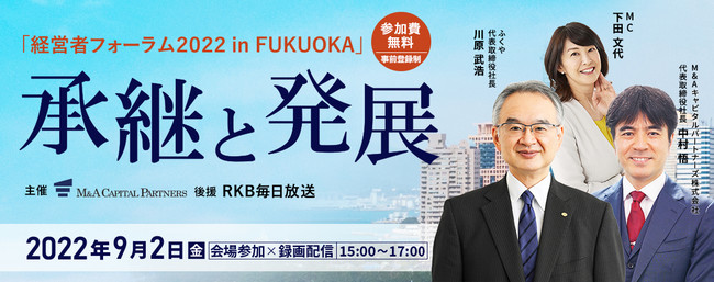 M&Aキャピタルパートナーズ株式会社(東京都千代田区・代表取締役社長 中村悟)は、福岡県で無料セミナー「経営者フォーラム2022 in FUKUOKA」を2022年9月2日(金)15:00~17:00に開催いたします。