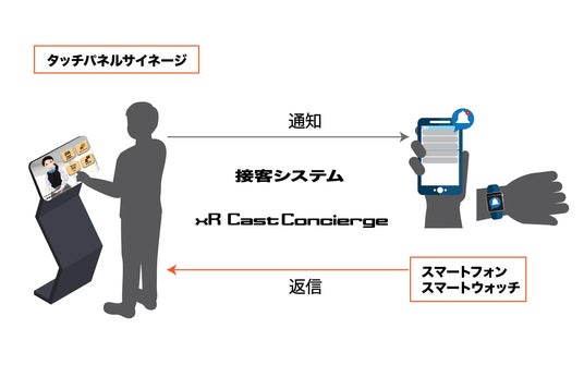 店舗に来店されるお客様のお悩み事に応じて、3DCGのバーチャル店員によるご案内を行う自動応対システムです。個別対応が必要なお客様には、担当の店頭スタッフさんが携帯しているスマートフォンや、スマートウォッチに通知を行うことで、遠隔でのリモコン操作による回答や動画コンテンツ案内を行い、遠隔で接客することも可能です。アバター接客システム「xR Cast HoloPhone」と連携することで、有人リモート接客にも対応しております。また、オプション機能にて待ち番号システム機能も実装しています。