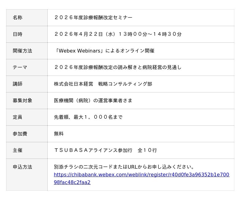 中国銀行(岡山市 頭取 加藤 貞則)では、2026年4月22日(水)に「TSUBASAアライアンス(※)」全10行と共同で「2026年度診療報酬改定セミナー」を開催します。
