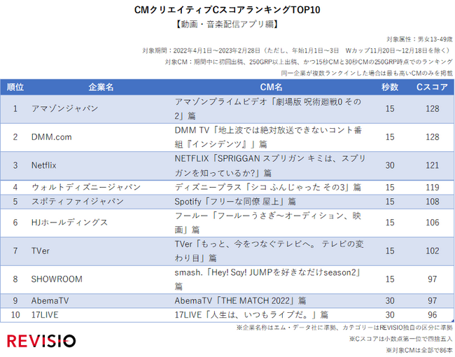 REVISIOは、2022年4月から2023年2月の期間で、視聴者の視線を釘付けにしたテレビCMのランキング「CMクリエイティブCスコアランキングTOP10【動画・音楽配信アプリ編】」を公開しました。