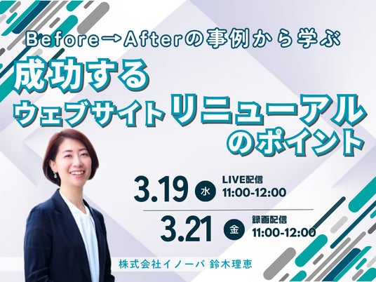 株式会社イノーバ(東京都新宿区、代表取締役:宗像 淳)は、2025年3月19日(水)、21日(木)の2日間、「Before→Afterの事例から学ぶ 成功するウェブサイトリニューアルのポイント」と題し、BtoB企業におけるサイトリニューアルに関するセミナーを開催いたします。
