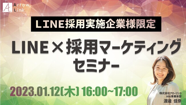 株式会社アローリンク(本社:兵庫県神戸市、代表取締役:蓬莱和真)は、1/12(木)にLINE採用実施企業様限定のオンラインセミナーを無料で開催します。「新採用戦略・即実践・LINE×採用マーケティング セミナー」と題し、コロナ禍に最適な"LINEを活用した採用戦略"について詳しくお伝えします。