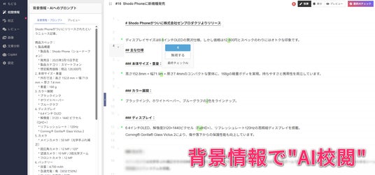 https://shodo.ink/) はAIによる文章の校正を提供するサービスですが、このたび事前に入力した背景情報(商品スペック、名称や仕様、価格等)をもとに文章を校閲する新機能をリリースしました。文章中の情報と入力済みの情報に齟齬がないかをチェックすることで、これまでは人の目による検証が必要だった校閲の作業の負担を軽減します。