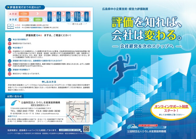 広島県中小企業技術・経営力評価制度とは、財務諸表に表れない自社の優れた事業価値を評価します。技術力やノウハウ(ビジネスモデルを含む)をはじめ、成長性・経営力を記載した評価書を作成し、公的機関である(公財)ひろしま産業振興機構(産振構)が発行します。取引先へのPRや金融機関からの資金調達等に活用でき、また評価によって明らかになった課題の解決に向け、産振構などの他の支援メニューをご提案させていただき、課題解決に向けて支援いたします。参考URL: