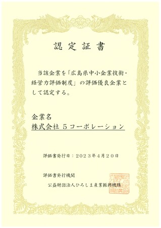 学習塾を運営する株式会社5コーポレーション(本社:広島県、代表者:田中 良典)は、公益財団法人ひろしま産業振興機構が運営する中小企業技術・経営力評価制度において、「評価優良企業」に認定されたことをお知らせします。企業価値向上に向けた本業支援の一貫として、広島銀行 広島東支店様よりお申込みいただきました。