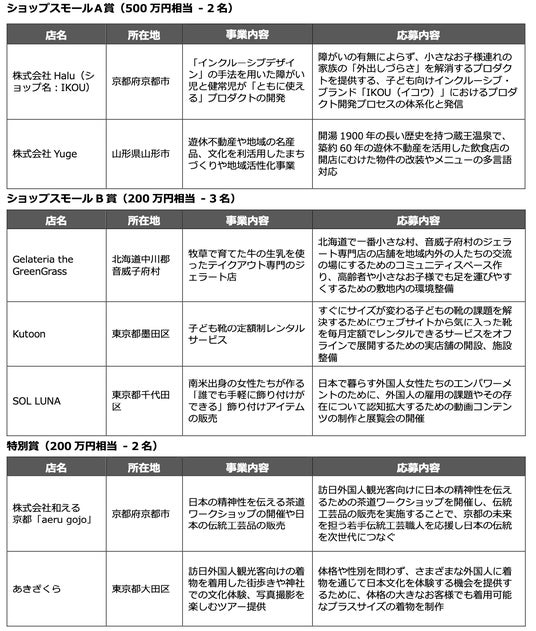 「RISE with SHOP SMALL 2024」は、性別や年齢、障がいの有無、人種や国籍、言語、LGBTQ+など、様々なダイバーシティ(多様性)に配慮したお店づくりや、地域の活性化に挑戦する中小店舗のオーナーを対象に、今年6月に募集しました。この度、書類審査と面談を通じて受賞した日本全国7名の中小店舗オーナーの皆様に対し、最大500万円相当(A賞:500万円相当(2名)、B賞:200万円相当(3名)、特別賞:200万円相当(2名))総額2,000万円の支援を提供します。