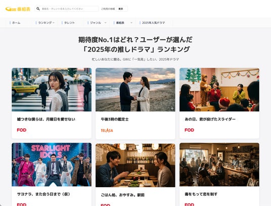 株式会社IPG(本社:東京都港区、代表取締役社長:立見 純一、以下「IPG」)は、2026年4月21日(火)より、Webブラウザ版の電子番組表サービス「番組表.Gガイド」にて、「期待度No.1はどれ?ユーザーが選んだ『2025年の推しドラマ』ランキング」を期間限定で開設いたしました。2025年に放送された人気ドラマの見逃し・配信情報を集約した『ドラマ特集』ページでは、作品をクリックするだけで視聴可能な配信サービスへダイレクトにアクセスでき、スムーズに視聴をお楽しみいただけます。